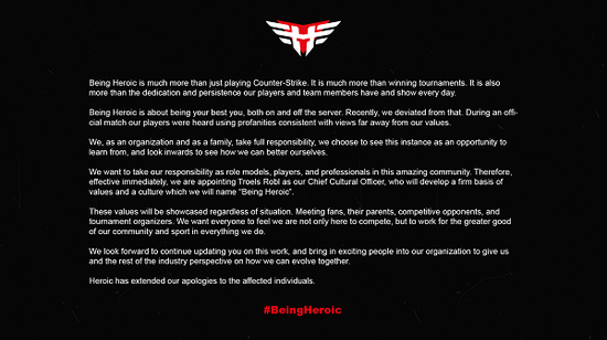 这封道歉信也宣布了Heroic将聘用一名“首席文化官”,他的工作将是“端正俱乐部价值观以及文化基础,树立俱乐部良好形象”,并将这个“首席文化官”命名为“Being Heroic”。