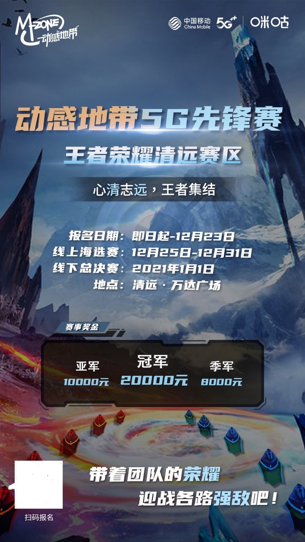 中国挪动通讯团体广东无限公司清远分公司主理、咪咕互动文娱无限公司承办的动感地带5G前锋赛王者光彩清远赛区报名炽热开启,赛事经过线上线下联动的形式进行,冠军奖金最高达两万元!今朝赛事报名已启动,玩家可经过下载“咪咕快游”APP,点击下方“电竞”进入赛事页面便可报名。