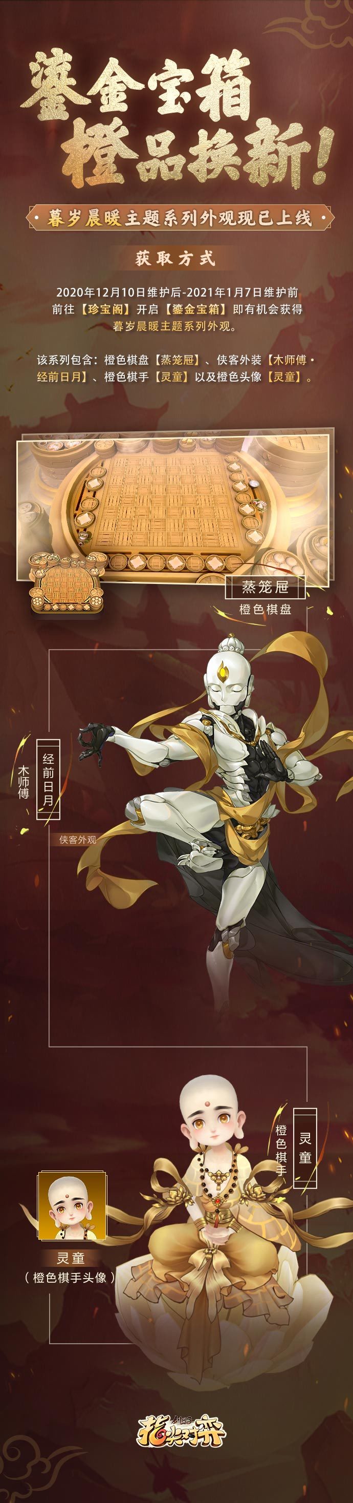 2020年12月10日保护后-2021年1月7日保护前,返回【瑰宝阁】开启【鎏金宝箱】即无机会取得【暮岁晨暖】主题系列外观。其内更有诸多精巧外观殊效,期待侠士们前来猎取!