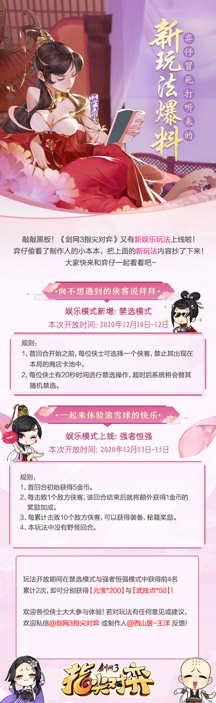 【禁选模式】下架后,文娱弄法【强人恒强】也将正在厥后开放!列位侠士若对弄法有任何定见,欢送私信民间微博@剑网3指尖棋战 或制造人@西山居-王洋 进行反馈!