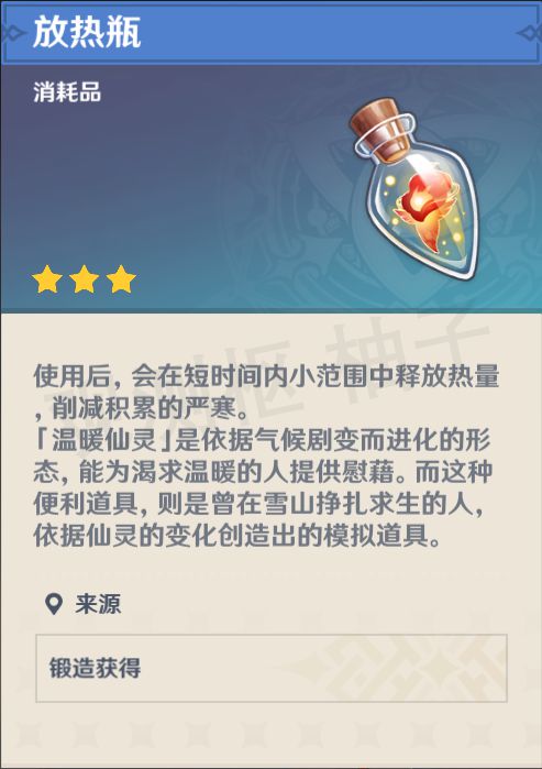 【忍冬之树供奉等级4解锁】放热瓶:一次性消耗品,使用之后能够在5s内持续降低严寒条的积累值,防止旅行者的严寒条积累进度超过20%。锻造一次需要2个烈焰花蕊和2个星银矿石。