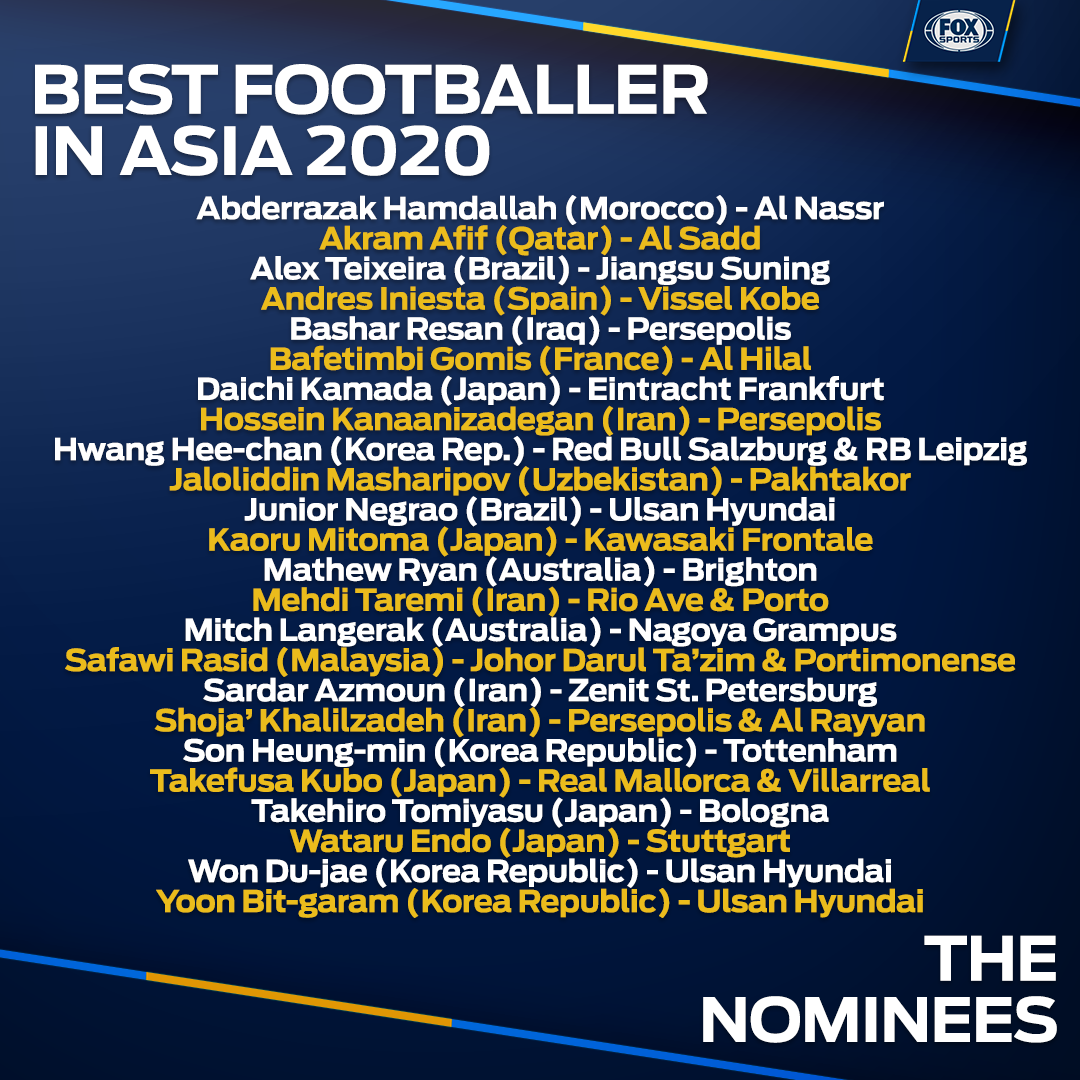 哈默德(利雅得胜利/摩洛哥)、阿费夫(萨德/卡塔尔)、特谢拉(江苏苏宁/巴西)、伊涅斯塔(神户胜利船/西班牙)、巴沙尔(波斯波利斯/伊拉克)、戈米(利雅得新月/法国)、镰田大地(法兰克福/日本)、侯塞尼-卡纳尼扎德甘(波斯波利斯/伊朗)、黄喜灿(萨尔茨堡红牛&莱比锡红牛/韩国)马沙里波夫(塔什干棉农/乌兹别克斯坦)、儒尼奥尔-内冈(蔚山现代/巴西)、三笘薰(川崎前锋/日本)、马修-瑞恩(布莱顿/澳大利亚)、塔雷米(阿维河&波尔图/伊朗)、朗格拉克(名古屋鲸鱼/澳大利亚)、拉希德(柔佛新山&波尔蒂芒人/马来西亚)、阿兹蒙(圣彼得堡泽尼特/伊朗)、哈里扎德(波斯波利斯&赖扬/伊朗)、孙兴慜(热刺/韩国)、久保建英(马略卡&比利亚雷亚尔/日本)、富安健洋(博洛尼亚/日本)、远藤航(斯图加特/日本)、元斗载(蔚山现代/韩国)、伊比加兰(蔚山现代/韩国)