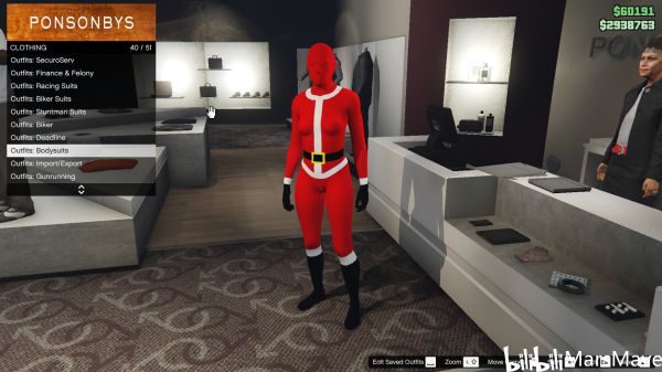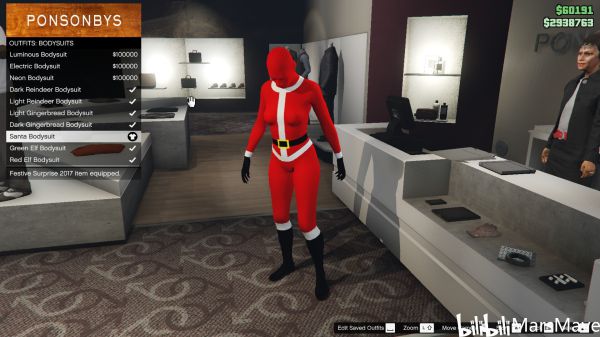 在服装店的套装->连体服->圣诞老人连体服(我是英文版,翻译可能不准确)