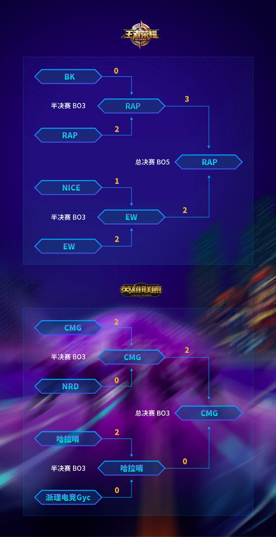 本次总决赛战况激烈,《王者荣耀》项目中,进入最终对决的RAP战队与EW战队鏖战5局,最终RAP战队在决胜局艰难取胜,加冕CMEL2020赛季《王者荣耀》项目总冠军。