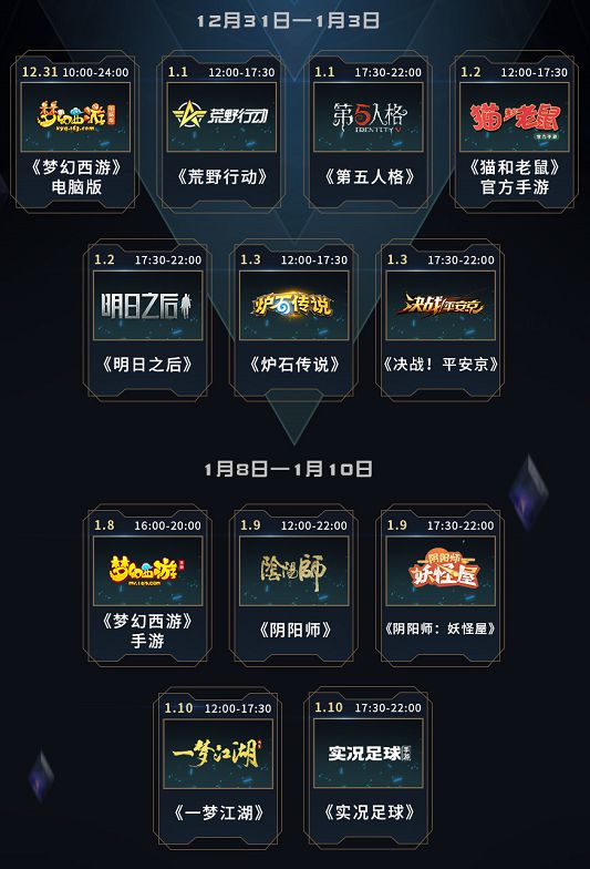 本次线下决赛于12月31日至1月3日、1月8日至1月10日于广州琶洲保利世贸博览馆3号馆进行,分两个周末展开为期7天的电竞盛宴,12个赛事项目将接连为广大电竞爱好者呈现一场场用热血浇筑的精彩激战!