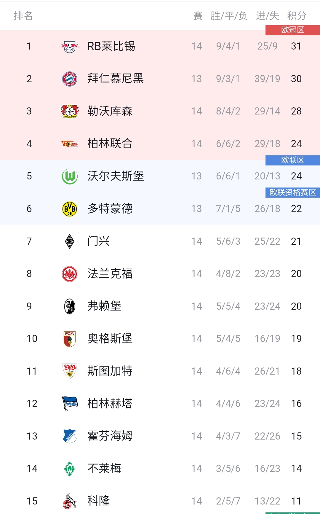 本场比赛取胜的RB莱比锡领先少赛一场的拜仁1分,暂时登顶积分榜首,失利的斯图加特积18分排在第十一位。