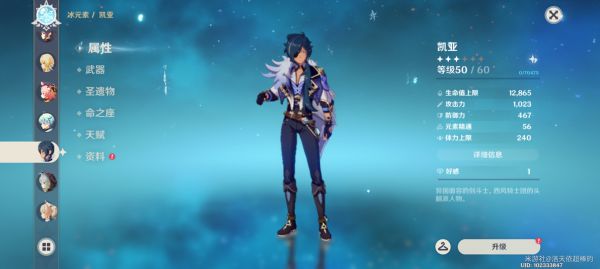凯亚推荐冰4或者冰2角斗士2宗室2,最佳圣遗物为冰4,武器天空风鹰黑剑笛剑腐殖