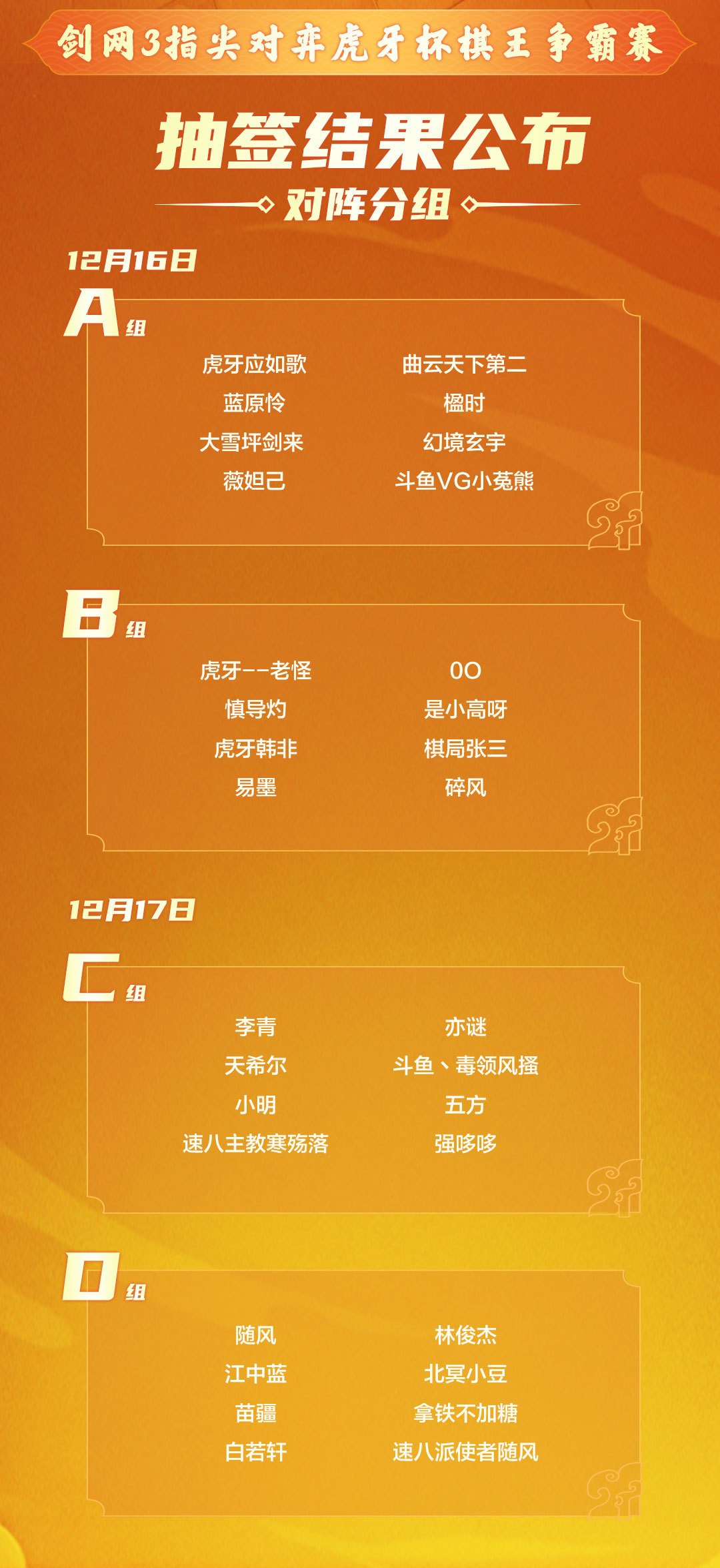 【虎牙杯棋王争霸赛——16日、17日裁汰赛对阵概况】