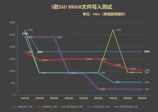 上图是汇总的数据,三星980PRO 1TB SSD无疑是最稳定的,到最后一直都保持着1.8GB/s的写入速度。