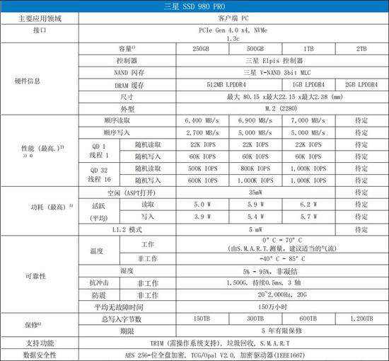 三星980PRO SSD的详细规格如下: