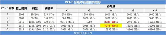 PCIe 4.0协议的传输率翻倍到了16GT/s,同样也是使用了128b/130b编码方案,PCIe 4.0 x4的吞吐量可以达到7976MB/s,是PCIe 3.0 x4的二倍。