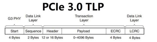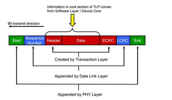 任何数据PCIe系统传输,都会产生一定的开销。PCIe设备是以TLP的形式发送报文的,数据报文在Device Core产生之后,在分别经过事务层(Transaction Layer)、数据链路层(Data Link Layer)、物理层(Physical Layer)之后会依次被增加ECRC,Sequence Number,LCRC,Start,END等数据块。