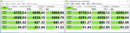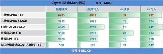 在CrystalDiskMark测试中,三星980 PRO 1TB SSD的顺序读取速度达到了惊人的6735MB/s,写入速度也有4949MB/s;4K读写速度分别为89MB/s和232MB/s。