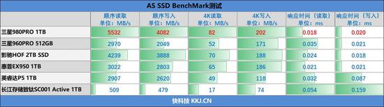 在4K性能方面,三星980PRO 1TB的读取速度达到了82MB/s,写入202MB/s,均傲视群雄。