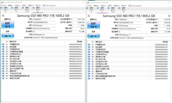 我们手上有2块三星980PRO 1TB SSD。此前在Zen3的评测中大量使用,其中一个的写入量已经达到了32TB,另外一个也有3TB。