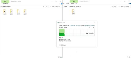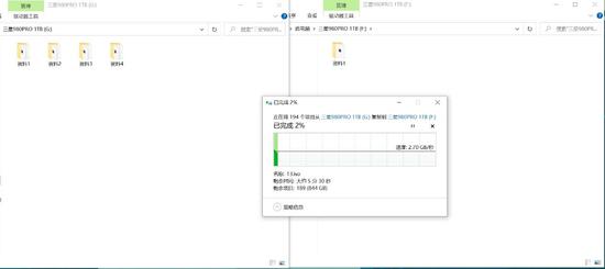 三星980 PRO 1TB SSD的实际容量是931GB,我们将890GB的数据从其中一块980 PRO 1TB SSD拷入到另外一块,看看这块SSD的缓外写入速度能有多高。