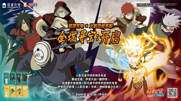 1月1日至1月14日,腾讯旗下《火影忍者》手游五周年庆典来袭,国内领先的智能共享充电品牌怪兽充电携手《火影忍者》手游开启“全城寻宝”跨界联动活动,集结游戏、动漫迷共掀重燃祭狂欢热潮。数万个火影忍者游戏定制宝现已登陆广州、深圳等全国各城市,用户进入怪兽充电的微信小程序或支付宝生活号的地图页面,搜索附近定制充电宝的位置,参与全城寻宝活动,就有机会获得丰厚奖品。