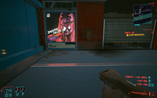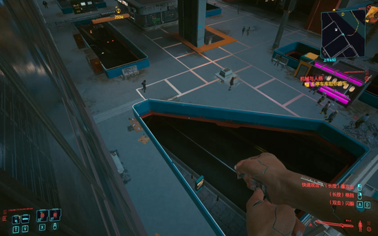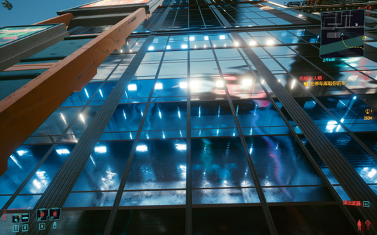 然后对着墙壁同时按跳跃(空格)+挥刀(鼠标左键),需要快速连按两个按键。这样一来V就可以沿着墙壁一路往上跳,通过武士刀实现刀刃爬墙了。