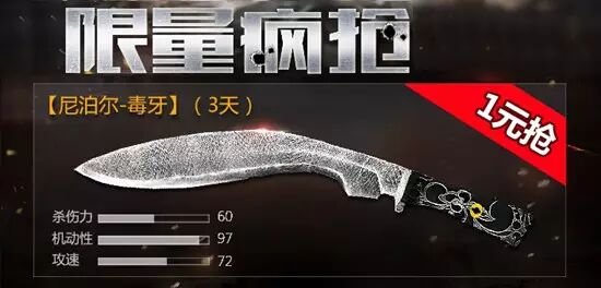 近战武器【尼泊尔毒牙】,在《创世兵魂》一直拥有不曾衰落的火爆人气。现商场推出对于此武器的限量低价抢购,一元钱限量疯抢,仅仅只要1元尼泊尔-毒牙带回家。8月13日到19日活动期间,每人只有一次的购买机会。属性好、性比价高,值得人手一份,势必能在全服掀起新一轮近战狂潮。
