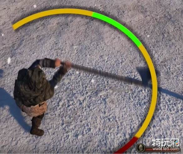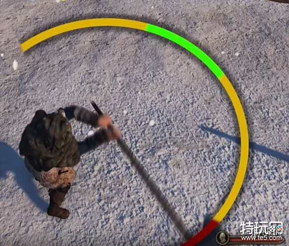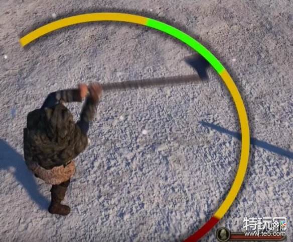 注意看斧头端到图中圆圈的不同位置,红色为最小,黄色为中等,绿色为最大。(以上伤害范围也会因为武器熟练度而变化,把握度越高-伤害越高/把握度越低-伤害越低)。