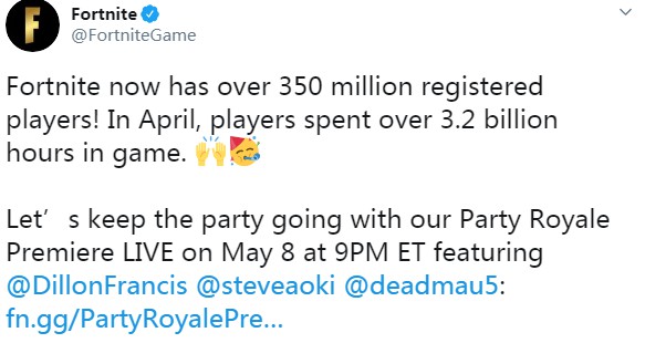 在发推庆贺的同时,《堡垒之夜》官方还表示将于美国东部时间5月8日晚9点(北京时间5月9日早9点)举办皇家派对首映活动(Party Royale Premiere LIVE)。