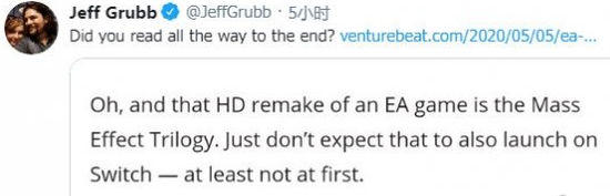 EA在季度财报中提到他们将在2021财年(2020.4.1-2021.3.31)发售一个未公布的高清重制版游戏,根据外媒venturebeat编辑Jeff Grubb的消息,这个未公布的重制游戏是《质量效应:三部曲》!