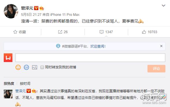 澄清一波:禁赛的新闻都是假的,已经意识到不该骂人,夏季赛见