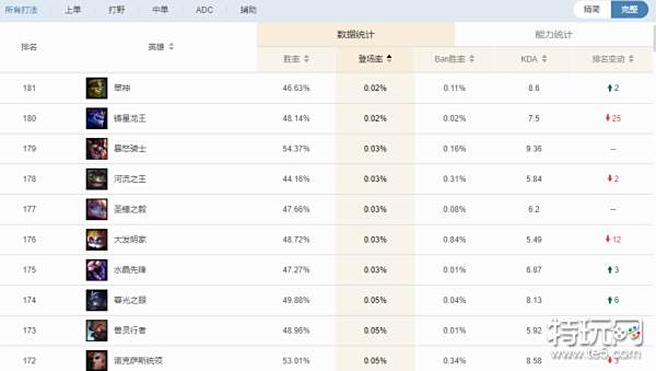 以下是国服登场率倒数前十的英雄,不出意外榜首位置果然是翠神