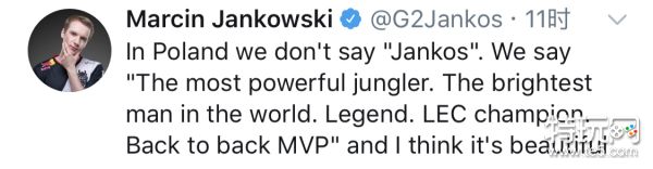 Jankos:在波兰我们不说:“Jankos”,我们说的是:“最强打野”、“世界上最帅的男人”、“传奇”、“LEC的冠军”以及“二连MVP”,我觉得这些称呼真的太棒了~