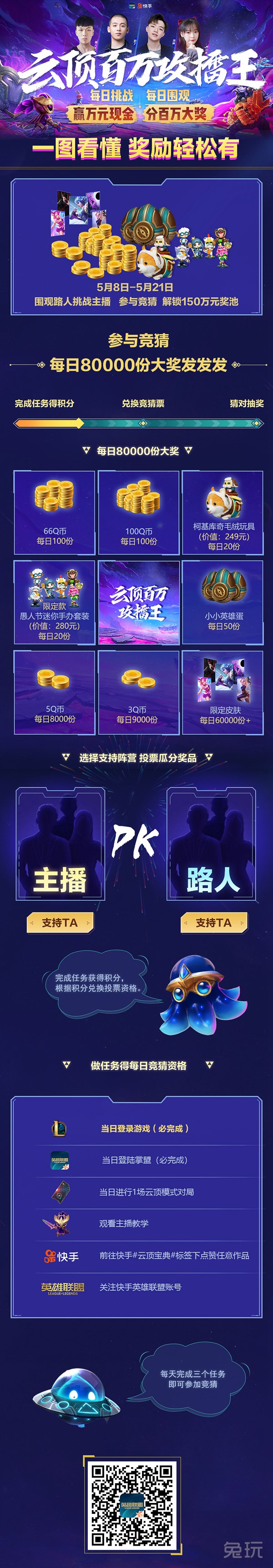 云顶新赛季“银河战争”已经上线1月有余,掌上英雄联盟联合快手APP共同打造的《百万云顶攻擂王》海选阶段已经悄然落幕,今日,云顶擂台挑战正式拉开序幕!5月8日-5月21日,每日1位主播接受7名玩家挑战,围观的吃瓜群众虽然没有亲临战争,但是参与竞猜照样解锁150万总奖池!
