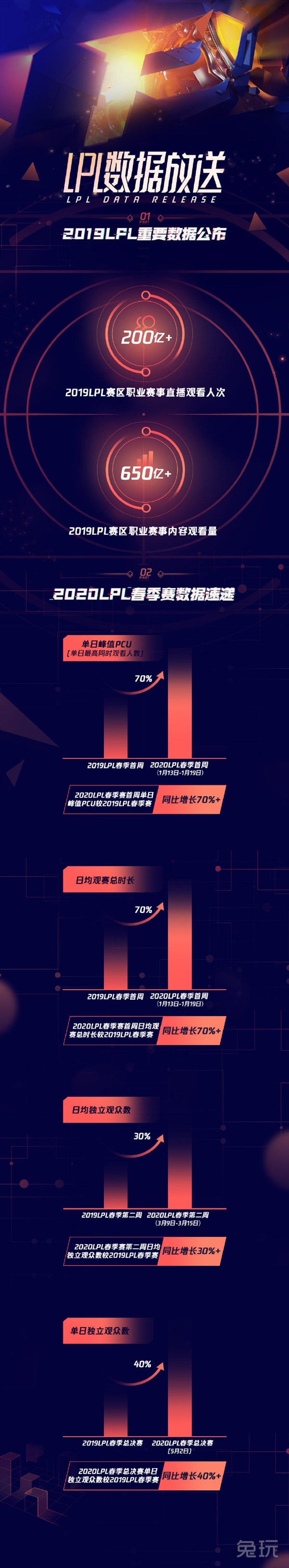 2019年LPL战队再次捧起英雄联盟全球总决赛冠军奖杯,赛事数据又创新高,LPL赛区职业赛事直播观看人次超过200亿,赛事内容观看量超过650亿。