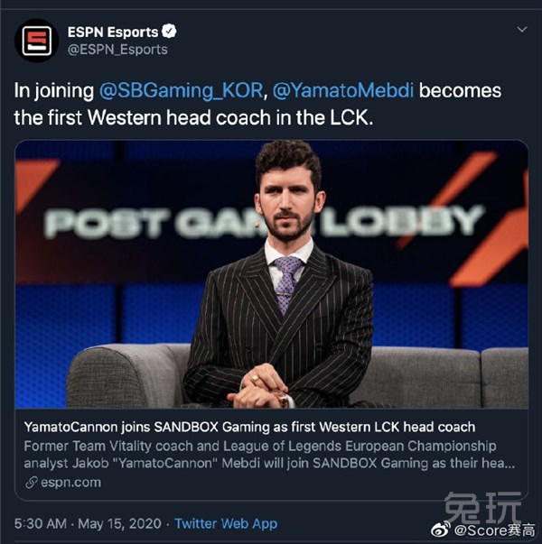 YamatoCannon将加入LCK联赛SB战队,成为首个加入LCK的西方教练。