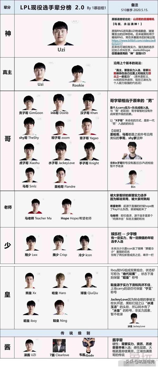 目前进入了季中的休赛期,由于今年受到疫情的影响,取消了一系列的赛事,所以在夏季赛来临前,有了较长的空档期。最近几天,无聊的网友们根据春季赛期间选手们的表现,排出了最新的一份LPL辈分图。当然,除了春季赛的表现外,这份辈分图也结合了之前的一些辈分排列、以及各种LPL的梗等等。而这份辈分图并不能代表所有观众的意见,仅仅是该图作者自己的看法。