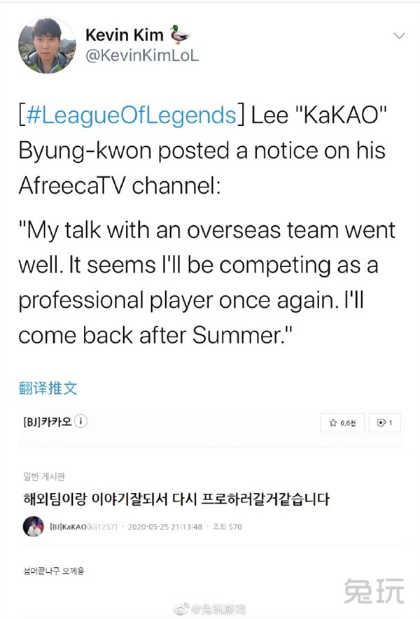 Kakao在自己的AfreecaTV频道上宣布:“我和一支海外俱乐部的沟进行得很顺利。我将会在夏季赛后再次回归职业。”