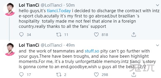 今日INTZ上单选手Tianci更新推特,宣布已与INTZ解约: