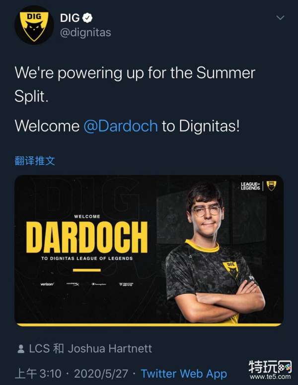 今日DIG在官推宣布春季赛刚刚加入TSM的打野选手Dardoch加入。