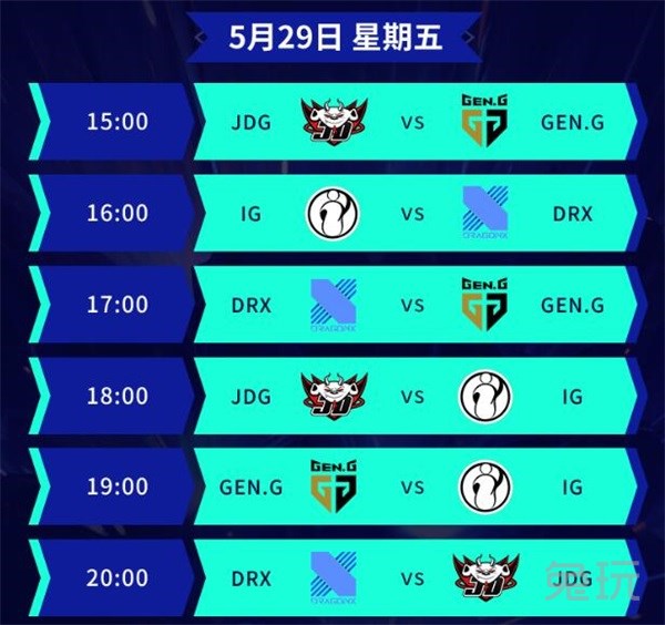 在北京时间5月29日下午15:00,2020英雄联盟季中杯迎来了小组赛第二个比赛日,B组的JDG、IG、GEN和DRX将分别进行BO1单循环对抗,竞争余下两个半决赛的晋级名额。在FPX和TES已经取得了A组的出线资格后,LPL队伍能否保持首日强劲的势头,成功挺进淘汰赛阶段呢。