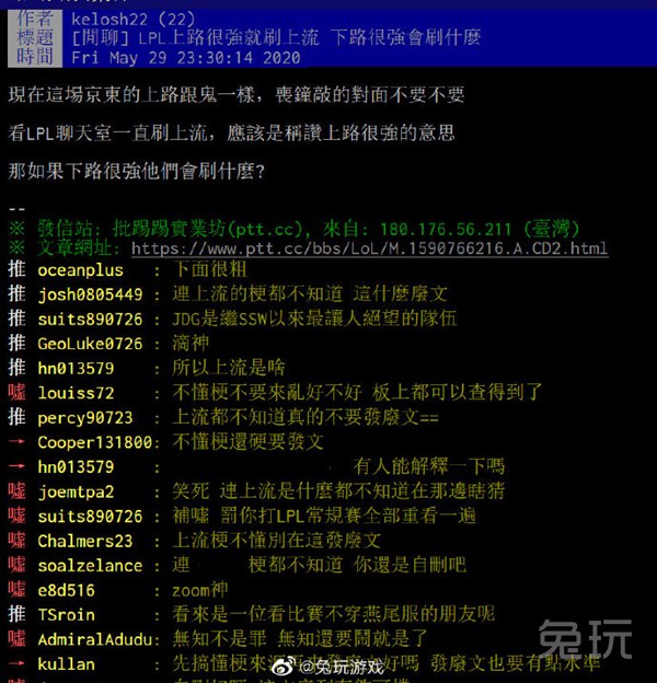 编后语:关于《不懂JDG的上流梗 PTT论坛某网友被群嘘》关于知识就介绍到这里,希望本站内容能让您有所收获,如有疑问可跟帖留言,值班小编第一时间回复。 下一篇内容是有关《季中杯赛小组赛BP率最高的英雄——韦鲁斯》,感兴趣的同学可以点击进去看看。