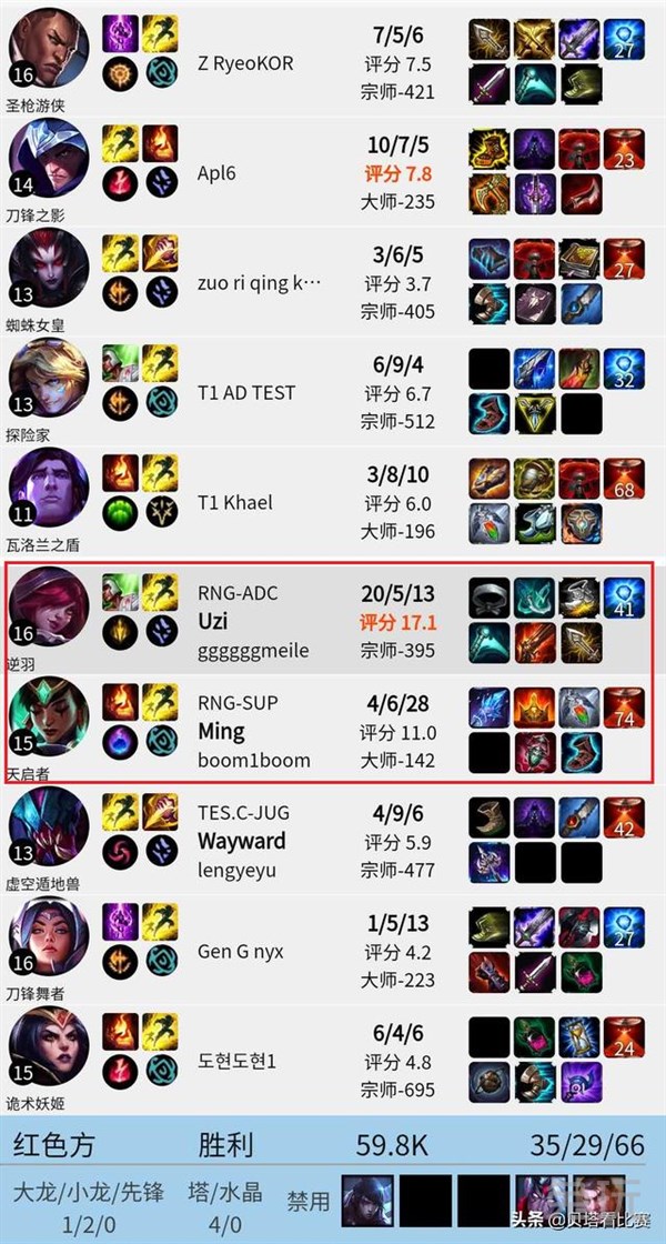 从Rank的表现来看,UZI绝对还是顶尖AD的实力,一样的敢打敢拼,会找输出位置,发育打团两不耽误,可以说的确没到退役的地步。而且最近UZI玩韩服玩的非常频繁,这次又是和ming一起双排,也让很多粉丝还抱有幻想,也许他还有机会重回赛场。当然也有人泼冷水认为应该是Ming想要在UZI职业生涯的最后一段时间,再多陪他打打韩服,因为退役之后他的韩服账号就会被回收了,后面想再玩就很难了。