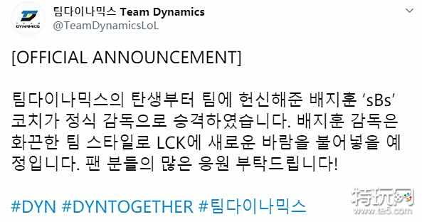 DYN今日官宣,将教练‘sBs’正式提升为监督。