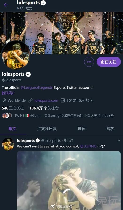 2018年MSI,RNG夺冠的时候,LOL官推曾用过一样的图作为头像和封面,纪念Uzi第一个国际赛事的冠军,也纪念RNG夺冠。