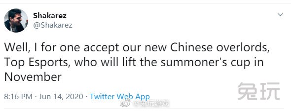 LEC内容制作者:仅代表我个人欢迎我们新的中国霸主,将在11月举起召唤师奖杯的Top Esports。