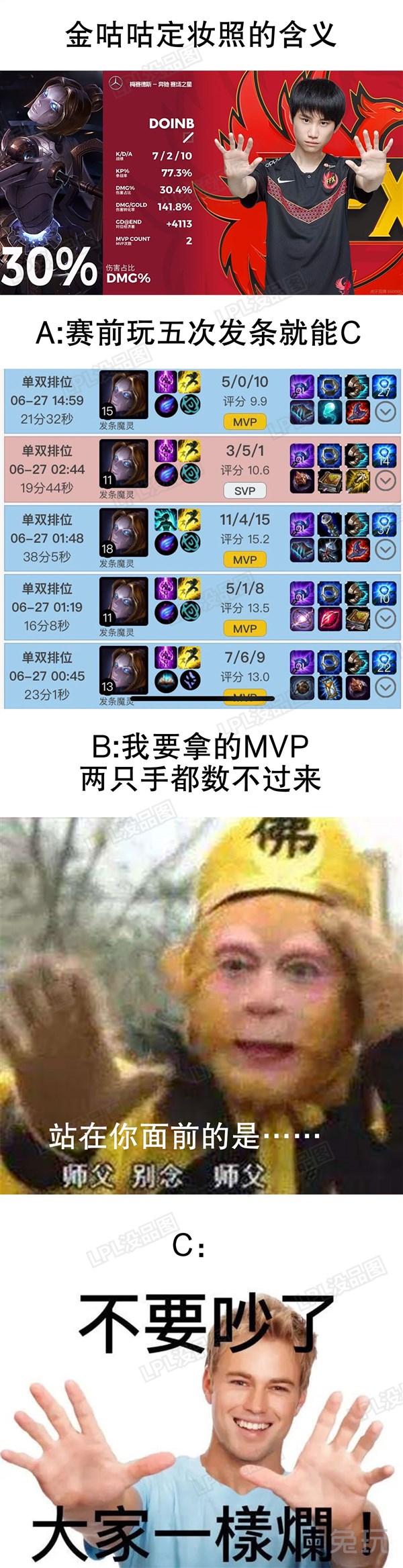 编后语:关于《LPL赛事没品图:金咕咕定妆照的含义》关于知识就介绍到这里,希望本站内容能让您有所收获,如有疑问可跟帖留言,值班小编第一时间回复。 下一篇内容是有关《LPL夏季赛6月28日首发,Flandre首发登场》,感兴趣的同学可以点击进去看看。