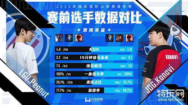 首先KDA方面,Kanavi和Peanut分别以4.8和4.6的KDA排名联盟第四、第六位。在击杀数据上,Kanavi以场均3.4的击杀数,相较于Peanut的2.3领先一筹。但两位打野选手在助攻以及前15分钟参与击杀这两项数据上不分伯仲,均以微弱的差距双双位于联盟顶尖水平,一血参与率更是同以100%制霸打野榜首。从承伤情况来看,由于Peanut和Kanavi在团队中时常担任carry位,而非功能型打野的风格特性,两位打野的承伤占比并不算特别突出,但在参团率上,Peanut以高达77.7%的参团率位列所有打野榜首,Kanavi则相对比较落后,在已登场过的21位打野中仅排名第17位。