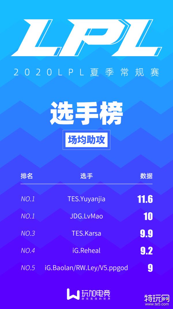 场均助攻榜依然由yuyanjia坐稳榜首,而iG两位辅助Reheal和Baolan也登上榜单!