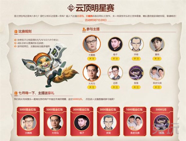 7月20日21:00,由大司马、东北大鹌鹑、迅哥、梨落、条皮、卷子、弈哥、Koro1等8大顶级主播将聚首峡谷棋盘,斗鱼直播最豪华的云顶交锋就此展开,与峡谷明星赛规则一样的是,此次云顶明星赛同样拥有两组对抗,其中卷子,弈哥与Korol属于大鹌鹑队,而迅哥,梨落和条皮兄弟则属于大司马队。