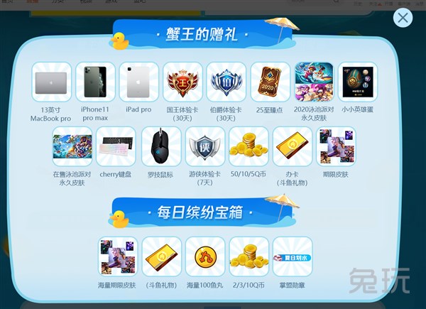 伴随着温度日益提升,以及职业赛场上大战频频,激烈而胶着的战斗之余,掌上英雄联盟携手斗鱼直播共同打造的“鱼乐一夏”活动也正如火如荼的进行中,在掌盟活动页面内,玩家可以通过完成一系列简单的任务进行抽奖,前1万名集齐8枚勋章的玩家必得100Q币奖励,此外还有神秘的“蟹王的赠礼”宝箱可以开出Macbook pro、iPhone 11、iPad pro、机械键鼠、永久皮肤等超级大礼,动动手指,或许你就是那个万众瞩目的幸运儿!
