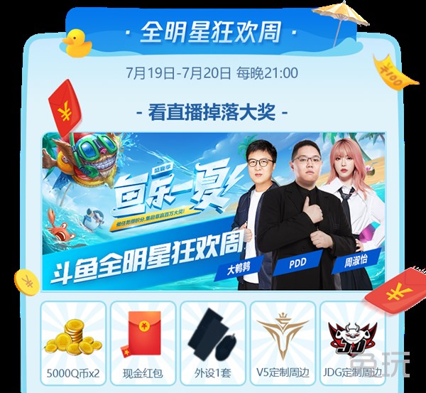此次节目中玩家可参与《斗鱼全明星狂欢周》节目答题,完成答题的玩家可获得积分的奖励,此外,本周节目的惊喜掉落包括5000Q币、3万元现金、外设、JDG/V5战队定制周边等。