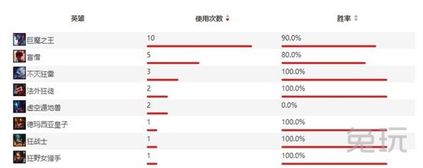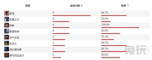 在英雄的使用胜率上,我们可以看到,Karsa的拿手英雄是巨魔,在出场10次的情况下,拿到了90%的可观胜率,而Ning的拿手英雄为盲僧,在出场9次的情况下,达到了66.7%的胜率。综合两人使用英雄胜率的比较可知,Karsa占据了上风。