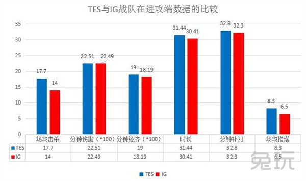 从上述图表中我们可以看出,TES与IG在进攻端的6项数据的对比中,TES有5项数据是优于IG的,仅在场均时长上是低于IG的。所以在两队进攻端的数据比较中,毫无疑问TES优于IG。